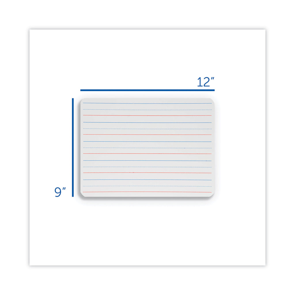 Bright white board's front face features five generously spaced handwriting-rule sets, with a blue headline and broken mid-line along with a red baseline, which makes it ideal for students who may still be developing their fine-motor skills. Back side is unruled with a standard whiteboard surface. Chip-proof, ghost-free, write-and-wipe design with a warp-proof hardboard core as well as smooth-rounded edges and corners.