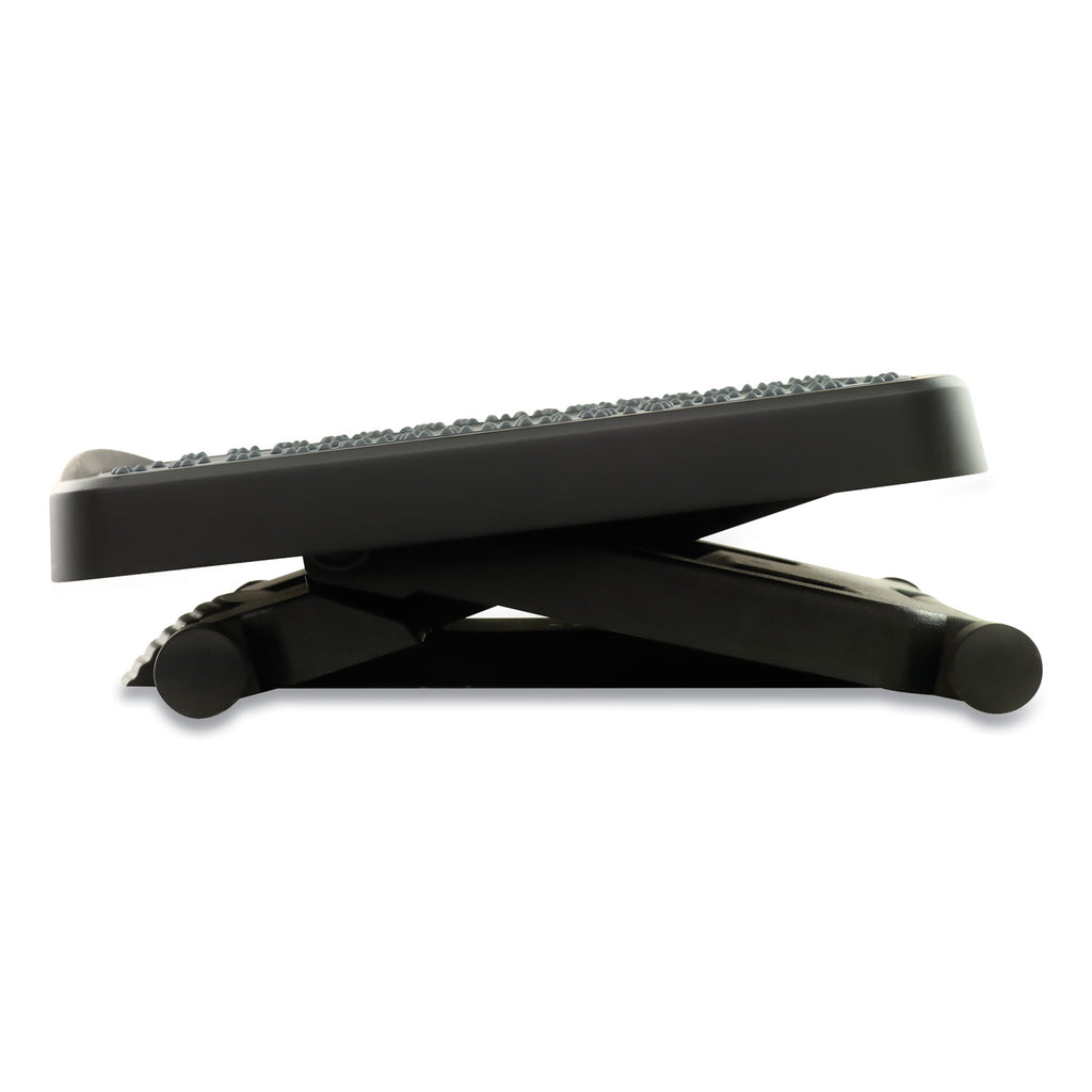 Free-floating platform allows for rocking motion to help reduce fatigue. Surface massage bumps help relieve work-related stress. Three platform height settings (4", 5.25" and 6.5") and up to 25 degree tilt. Elevates feet and legs to improve posture.