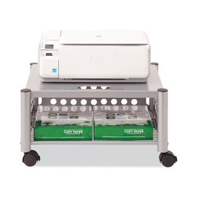 Durable steel and wire construction. Handy bottom shelf keeps supplies close at hand. Two surface grommets help route cords and cables; can also be used as a handle to pull stand from beneath worksurface.