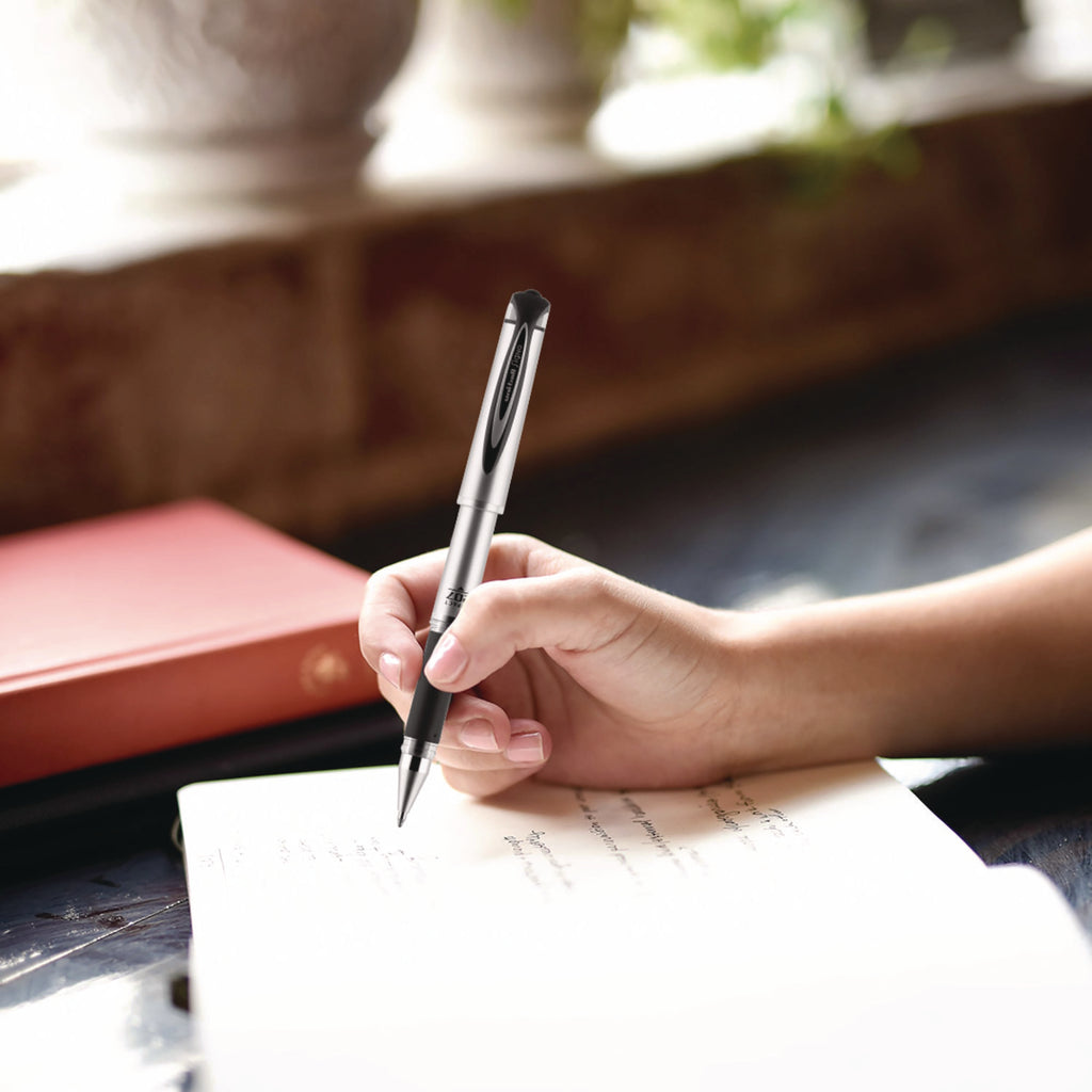Features a 1.0 mm bold point with a stainless steel tip that resists bending and breaking. Even-flowing, pigment-based gel ink renders an outstanding ink laydown for a smooth writing experience and strikingly bold lines. Us/e these capped stick gel pens for everyday writing tasks, check signing and all of your important signatures, trusting its quick-drying uni Super Ink.