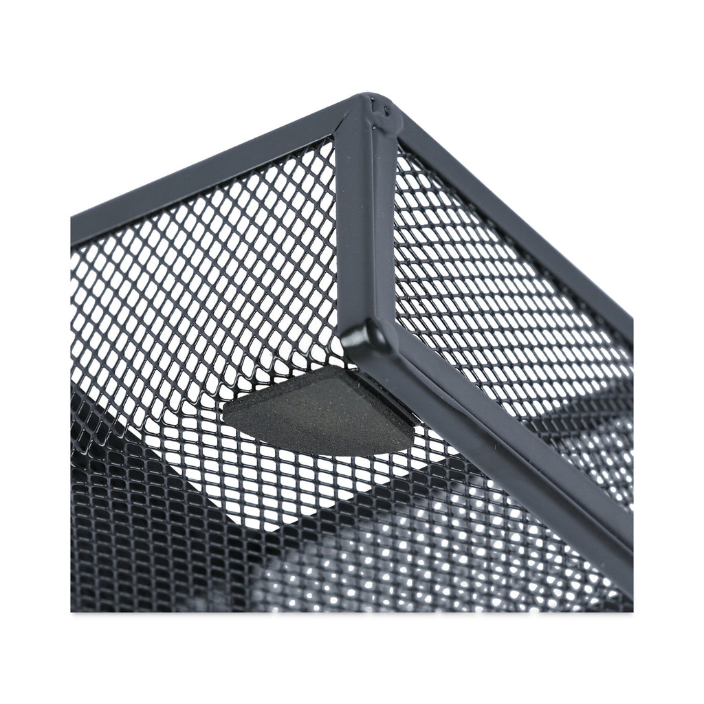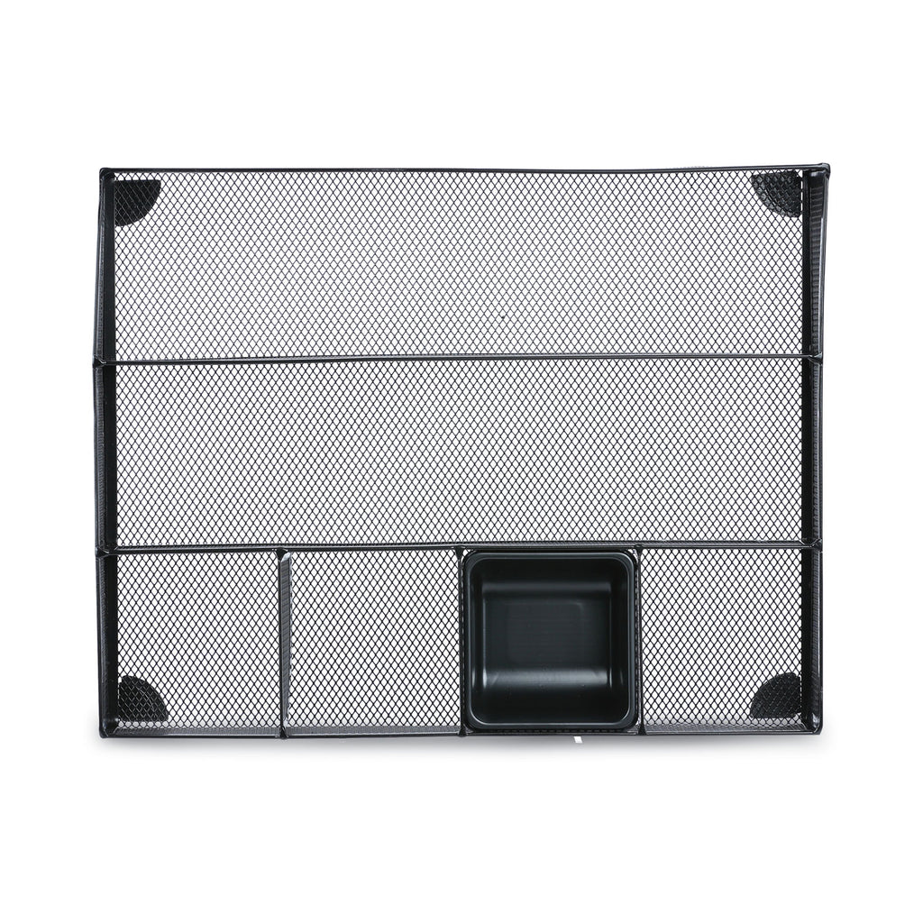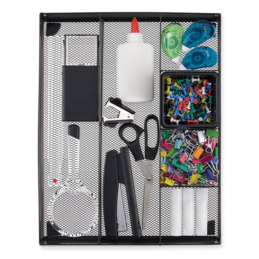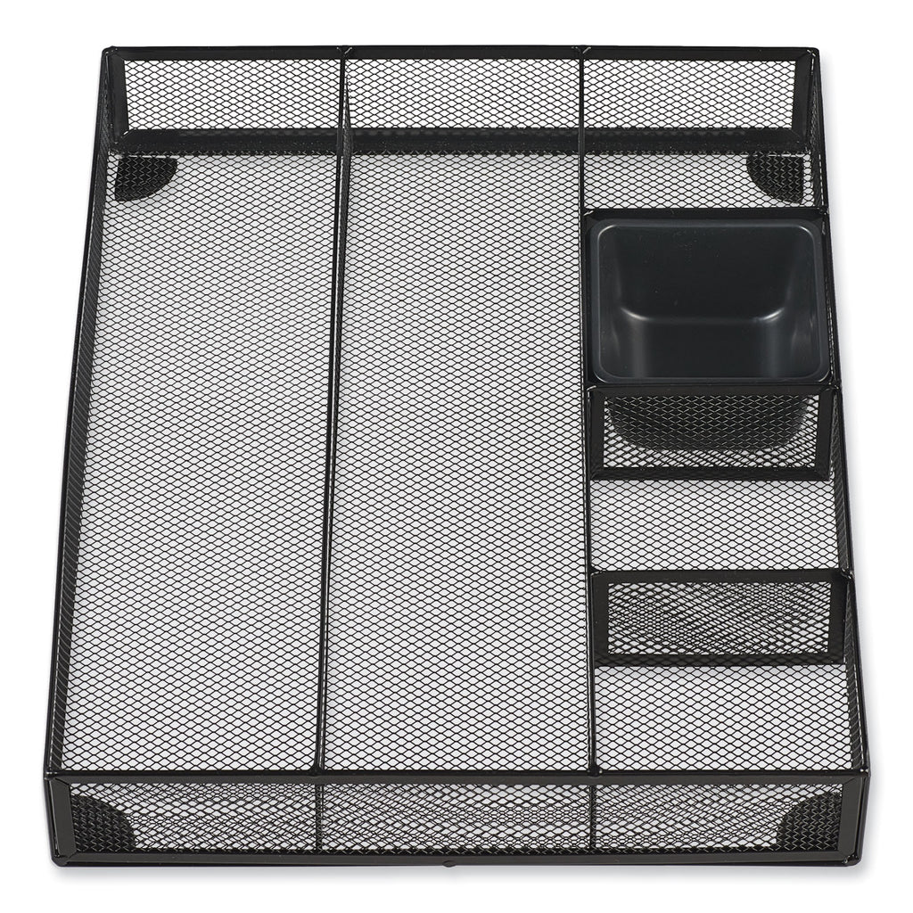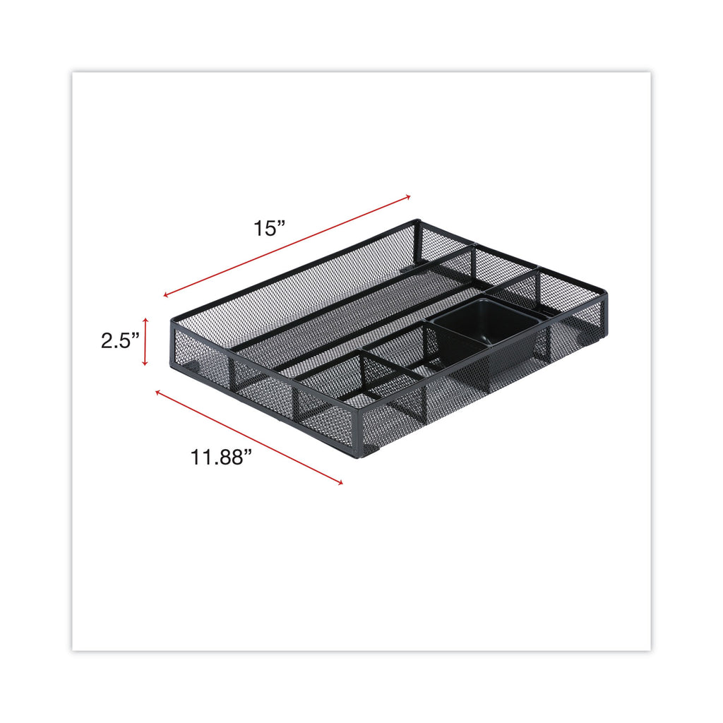 Deep multi-compartment organizer provides extra capacity to keep everything in its place in your drawer and easy to find. Perfectly sized to fit most common drawer sizes in file cabinets or pedestals. Two extra-long compartments for rulers, writing instruments, scissors, and sticky notes. Four smaller compartments to hold everyday office supplies including one plastic insert cup for tacks and pins. Durable metal mesh construction is both strong and stable to withstand years of use.