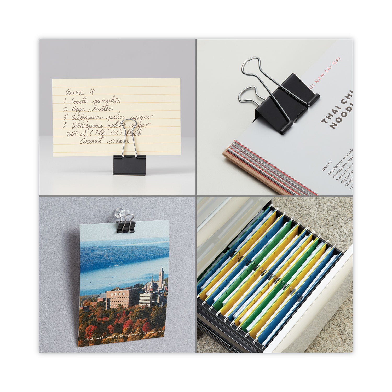 Ultra-efficient binder clips feature handles that can be hung, folded flat against clipped material, or removed for permanent binding. Efficient triangular design provides optimum strength and compression.