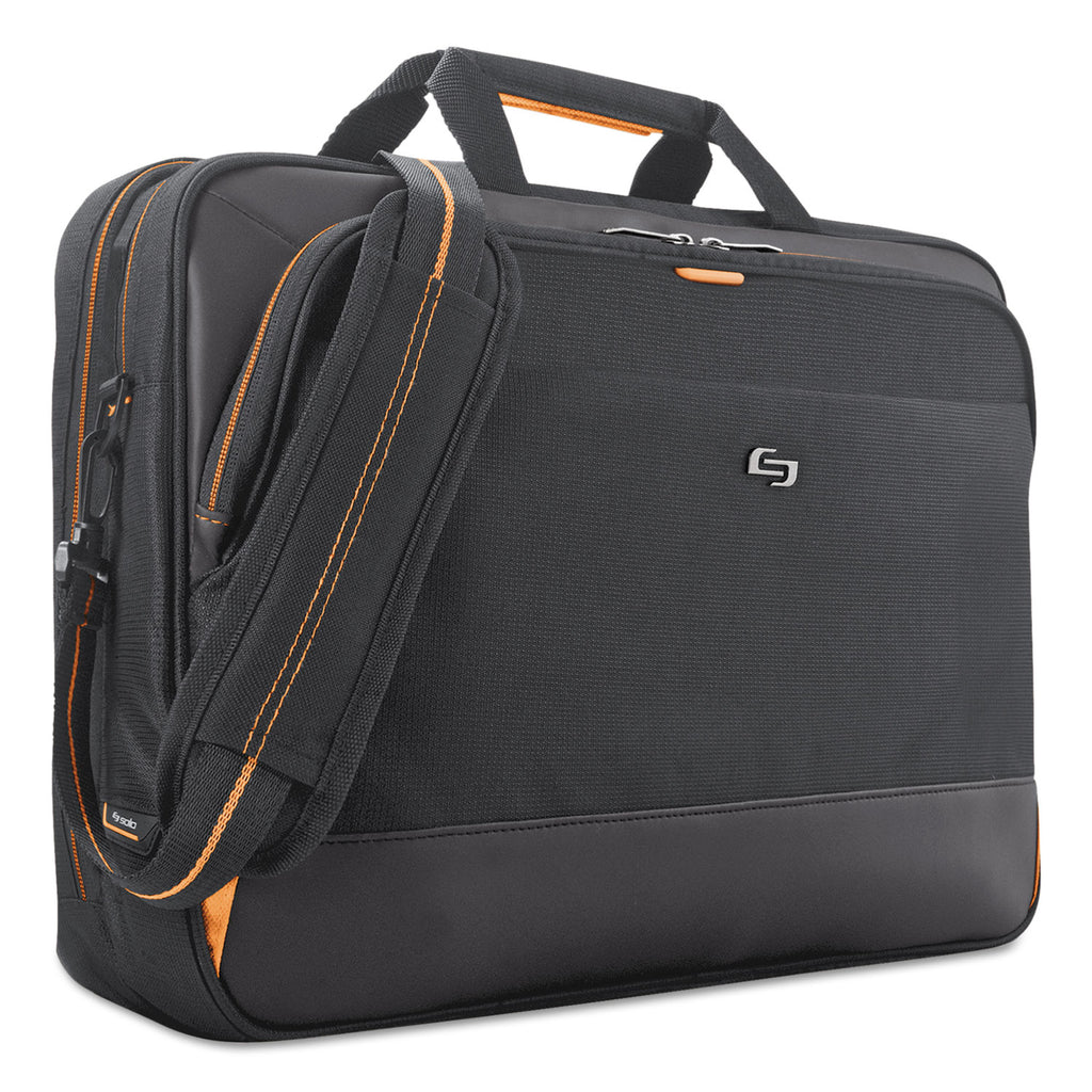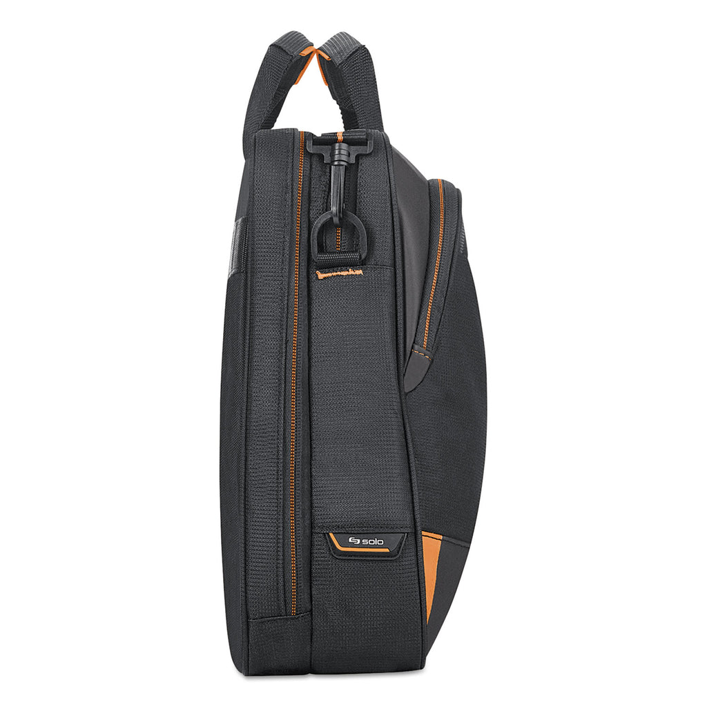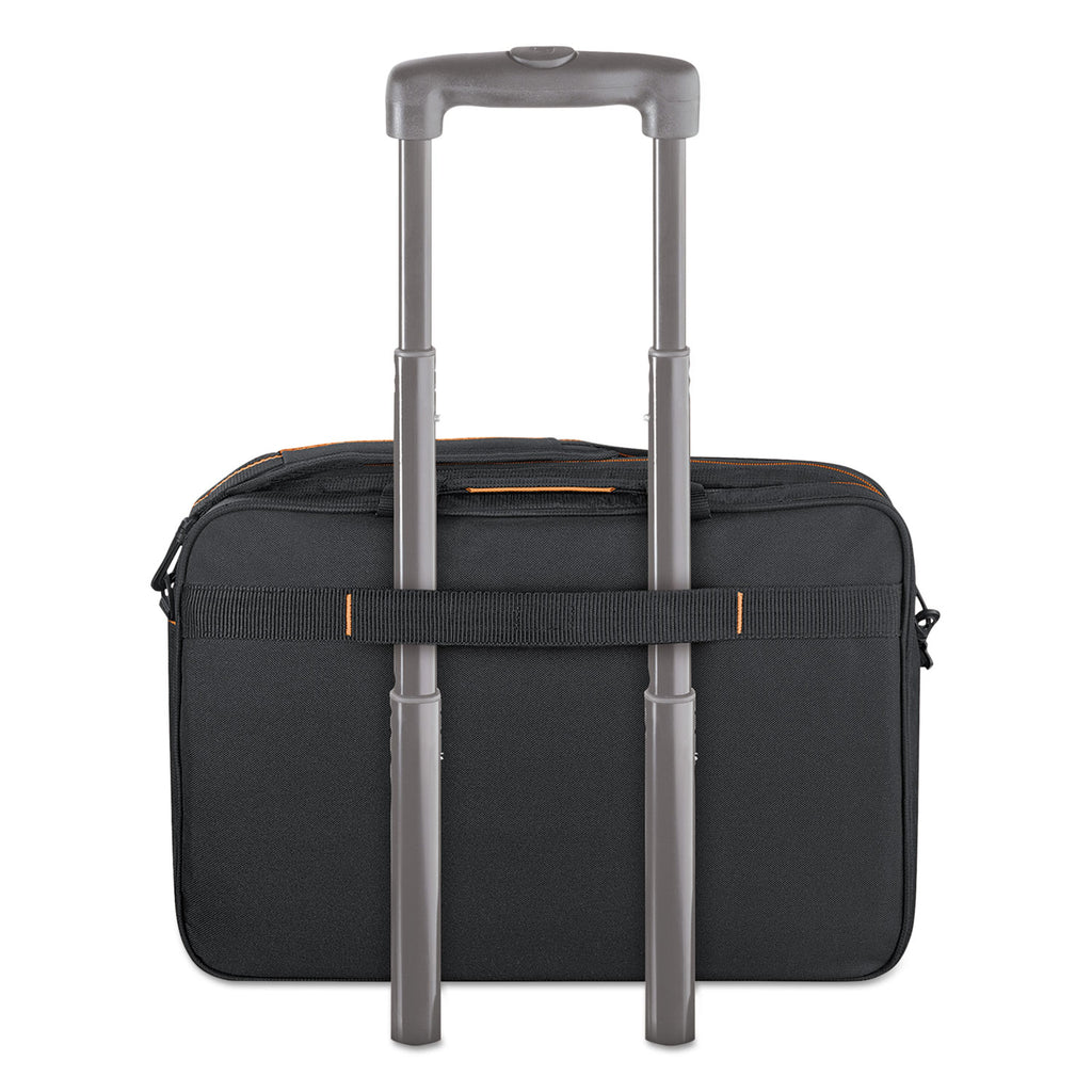 Multiple fully padded pockets protect laptops from 13" to 17.3". Internal iPad®/tablet pocket. Back strap slides over luggage handle.