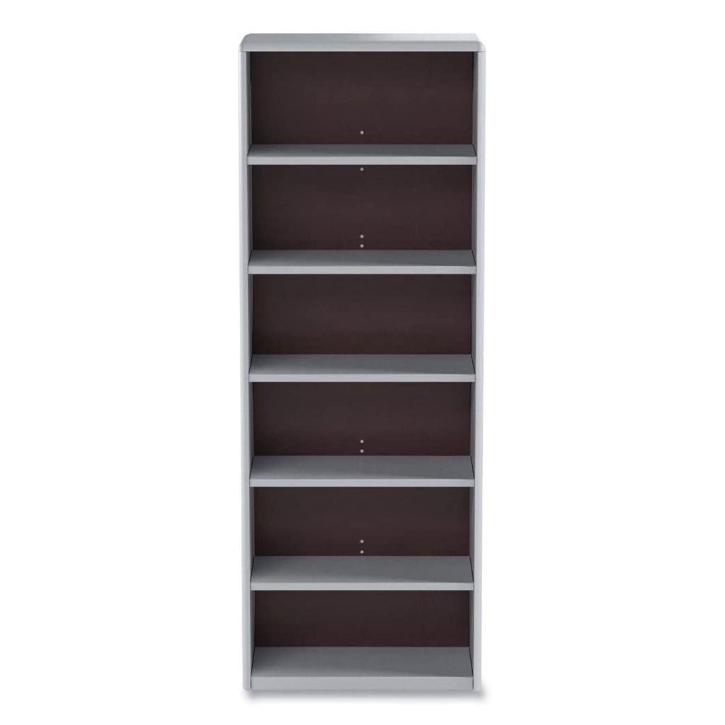 A workspace organizer with steel-constructed shelves and exterior. With a fiberboard backing, the bookshelf offers 12 deep bookshelves that can adjust in 1 increments during assembly. Plastic, snap-in radius corners provide speedy assembly. Fixed bottom and top shelves.