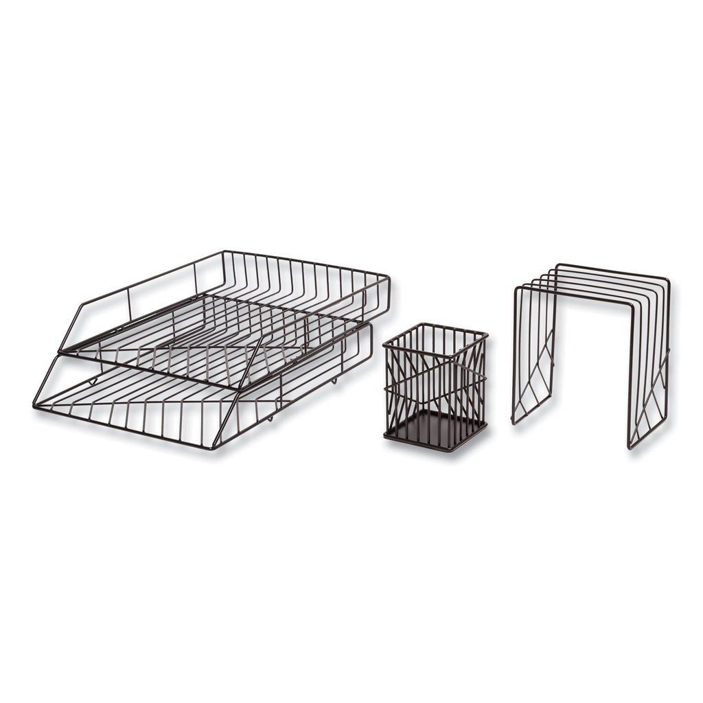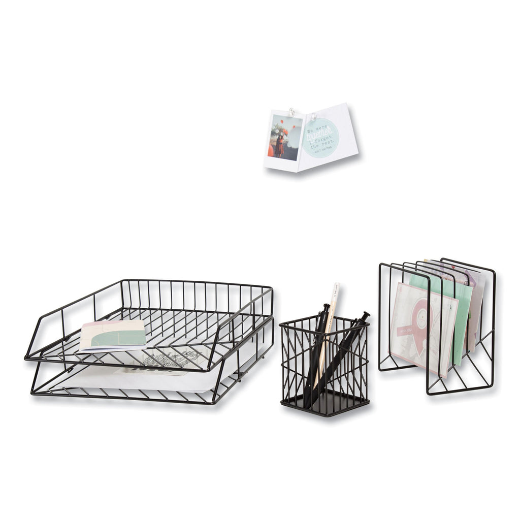Give your office a modern look with this four piece wire metal desktop accessories set. This desktop filing set is the perfect combination of fashion and function, allowing you to express your personal style while helping you get organized and declutter your work area. The desktop filing set displays a strong metal bent wire design that will complement any room decor, whether it is a traditional office or a home workspace.