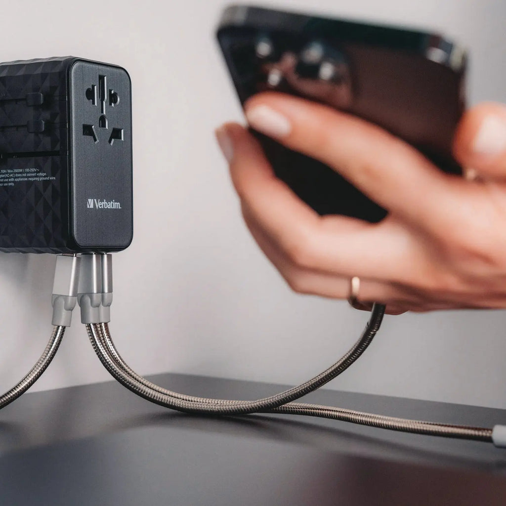 Compact and versatile solution for travelers. This 5-in-1 adapter allows simultaneous charging of five devices through AC and USB ports.