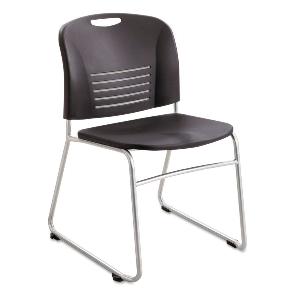 Sled base chair features a 350 lb. weight capacity and a wall saver design to help ensure no wall scrapes or damage. Cut-out handle in back for easy transport. Stacks up to 12 high on the floor or 18 high on a chair cart for easy storage when not in use.