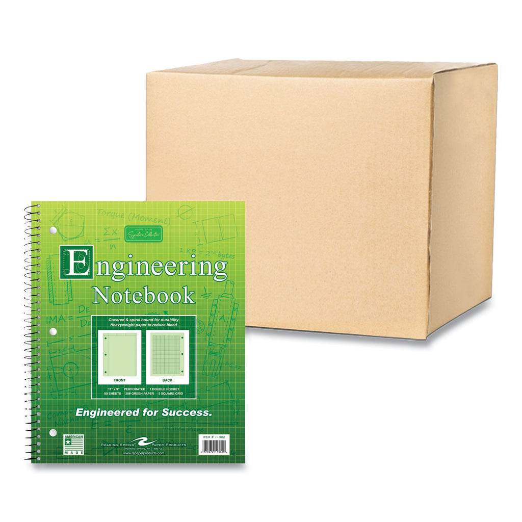 Part of the Signature Collection, these Engineering Notebooks are covered and spiral-bound for durability. Heavyweight paper reduces bleed. The 20-lb paper features a frame front with a 0.5" margin and a 5 x 5 enclosed grid on the back for precise sketches, record-keeping and notes. Each notebook contains an oversized double pocket under the cover for storing loose paper. Perforated, 8.5" x 11" sheets and cover are three-hole punched along the 11" binding edge so it can easily fit inside letter-size, three-ring binders.
