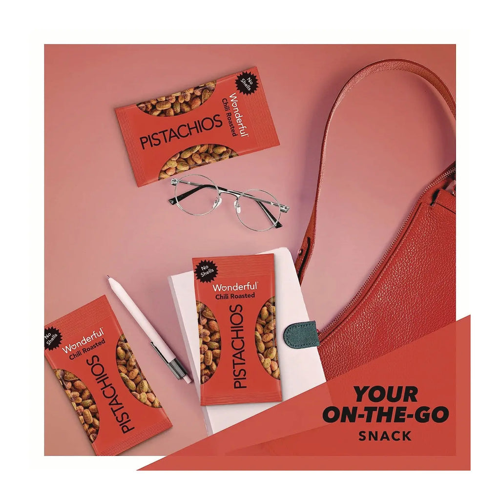 Turn up the heat with Wonderful® Pistachios No Shells Chili Roasted. They're bursting with the big, bold flavors of red pepper, garlic, and vinegar to tingle your tongue and keep you craving more. Skip the shells and get spicy for Less Crackin', and More Snackin'.