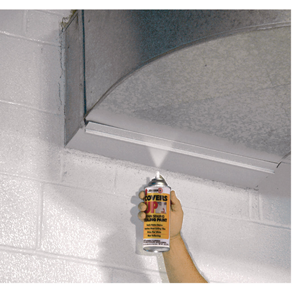 In a single, smooth, even blast, this ultra-convenient, all-in-one product permanently covers over and seals water stains while it touches up ceiling paint. Vertical, aerosol-spray format makes overhead application a breeze. Extremely versatile, it can be used on ceiling tiles as well as nearly any previously painted ceiling.